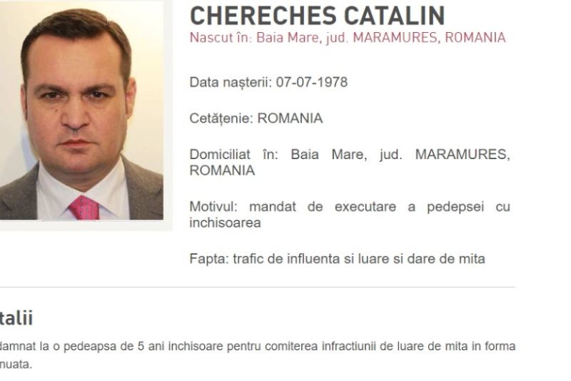 Dispărut de acasă, odată cu anunțarea sentinței finale de închisoare cu executare, primarul din Baia Mare, Cătălin Cherecheș, a fost dat în urmărire generală de către Poliția Română.