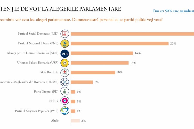 Întrebați ce partid ar alege având în vedere că pe 1 decembrie vor avea loc alegerile parlamentare, românii s-au pronunțat în favoarea PSD - 31%, urmat de PNL - 22%, AUR -14%, USR - 13%, SOS -10% și UDMR - 5%.
