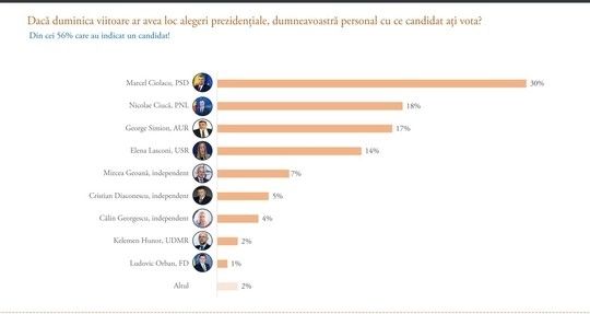 Liderul AUR, George Simion, se află la o distanţă foarte mică de Ciucă, cu 17% din intenţiile de vot. De asemenea, alte figuri politice importante sunt prezente în clasament: Elena Lasconi, reprezentând USR, a obţinut 14%, în timp ce candidaţii independenţi Mircea Geoană şi Cristian Diaconescu au fost cotaţi cu 7% şi, respectiv, 5%.