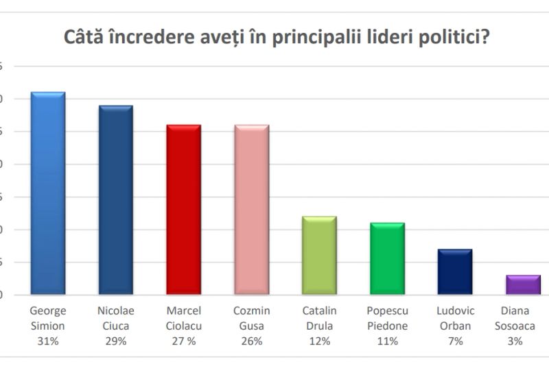 Prima întrebare a sondajului a fost „Câtă încredere aveți în principalii lideri politici”, iar românii au răspuns într-un mod surprinzător: George Simion se detașează în preferințe cu 31%, urmat de Nicolae Ciuca, cu 29%. Pe locul trei la capitolul încredere se clasează Marcel Ciolacu cu 27 %, urmat de Cozmin Gusa cu 26%. Liderul USR, Catalin Drula îi urmează în clasament cu 12% iar Cristian Popescu Piedone îi „suflă în ceafă”, cu un procent de 11%. Următorii în preferințele românilor sunt Ludovic Orban cu 7% și Diana Sosoaca, cu 3%.