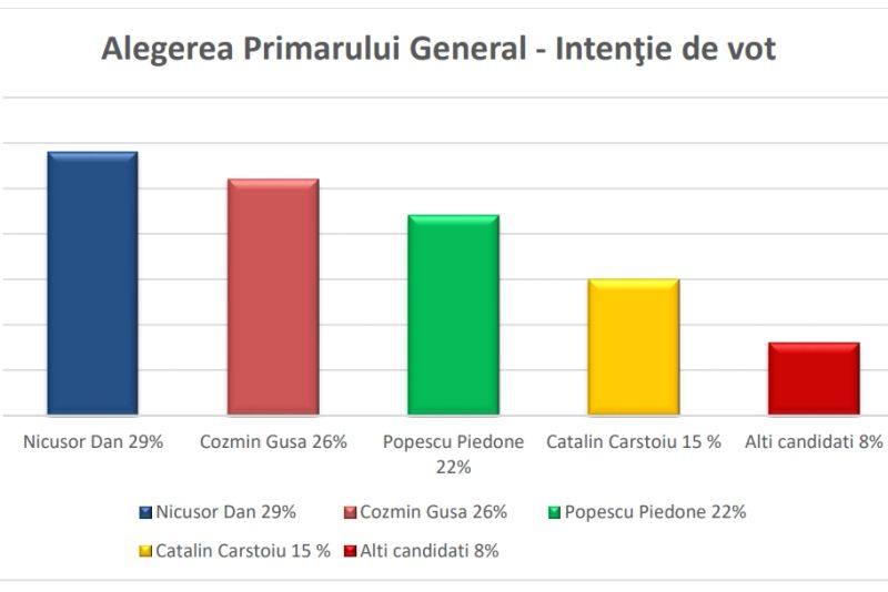 Al doilea aspect analizat de sondaj a fost acela al intenției de vot pentru alegerea Primarului General al Capitalei. Aici vedem o răsturnare a situației: Actualul primar, Nicusor Dan, conduce clasamentul cu 29%, urmat de Cozmin Gusa cu 26% și de Cristian Popescu Piedone cu 22%. Aceștia sunt urmați de Catalin Carstoiu cu 15 % și alti candidati cu 8%.